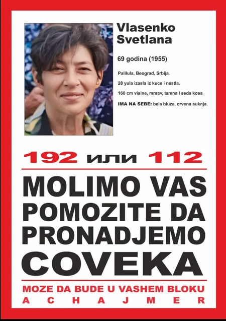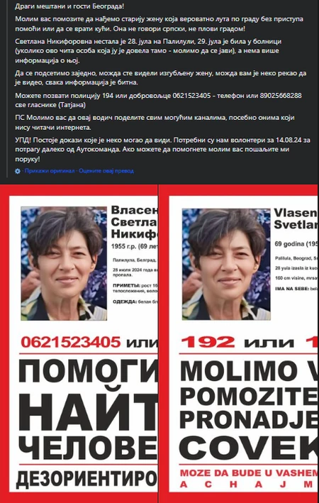 – Molimo vas da pomognete u pronalaženju starije žene koja verovatno luta gradom, bez mogućnosti da zatraži pomoć ili se vrati kući. Ona ne govori srpski i ne snalazi se u gradu! Svetlana Nikiforovna (69) nestala je na Paliluli 28. jula, 29. je bila u bolnici, a ako ovo čita osoba koja ju je tamo odvela, molimo vas da nas kontaktirate, mi biše informacija o njoj nemamo – navodi se u objavi u grupi Rusi u Beogradu koji je postavio jedan mladić Nik.