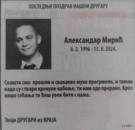 – Svašta smo prošli i svakakve muke pregrmeli i taman kada su stvari krenule na bolje, ti nam ode prerano. Kroz naša sećanja ti ćeš uvek biti s nama. Tvoji drugari iz kraja – piše u čitulji.